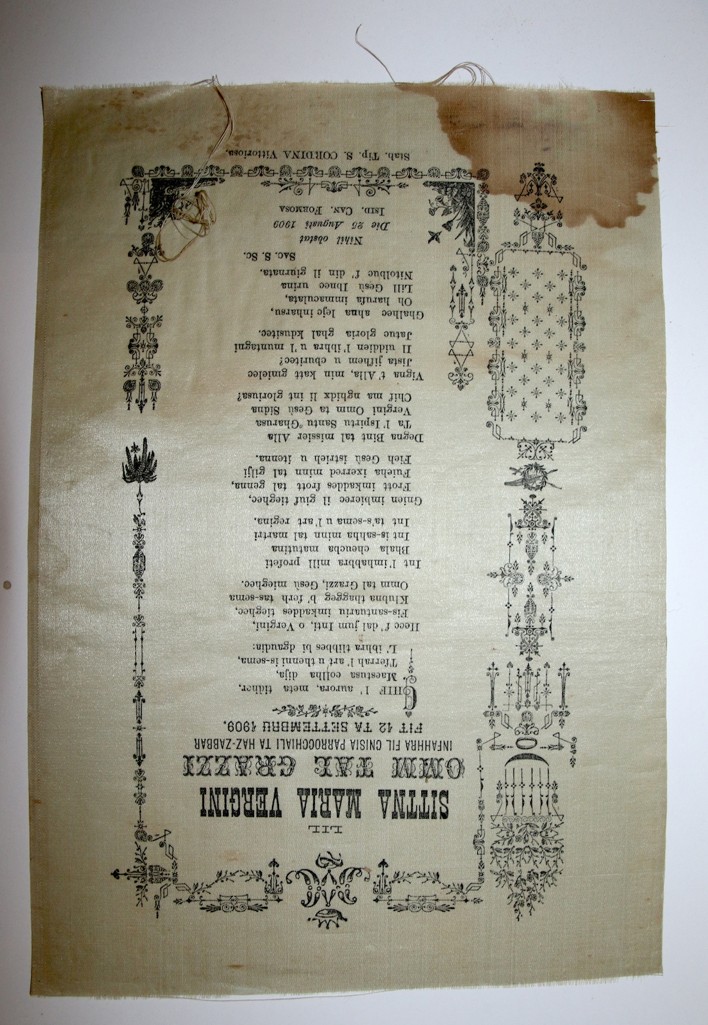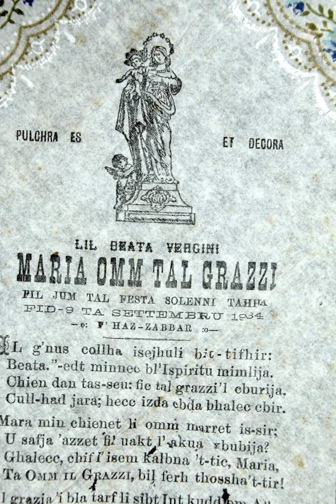 “The word ‘Sonnet’ is derived from the Latin word ‘sonus’ which means ‘sound’. The Sonnets, known as ‘Sunetti’ in Maltese, originated as printed texts containing messages which were scattered among streets as part of the village festivities. These Sonnets were thrown during the feast for the additional reason that most villagers were illiterate; therefore, these texts could be read out loud by literate persons while others gathered around to listen.