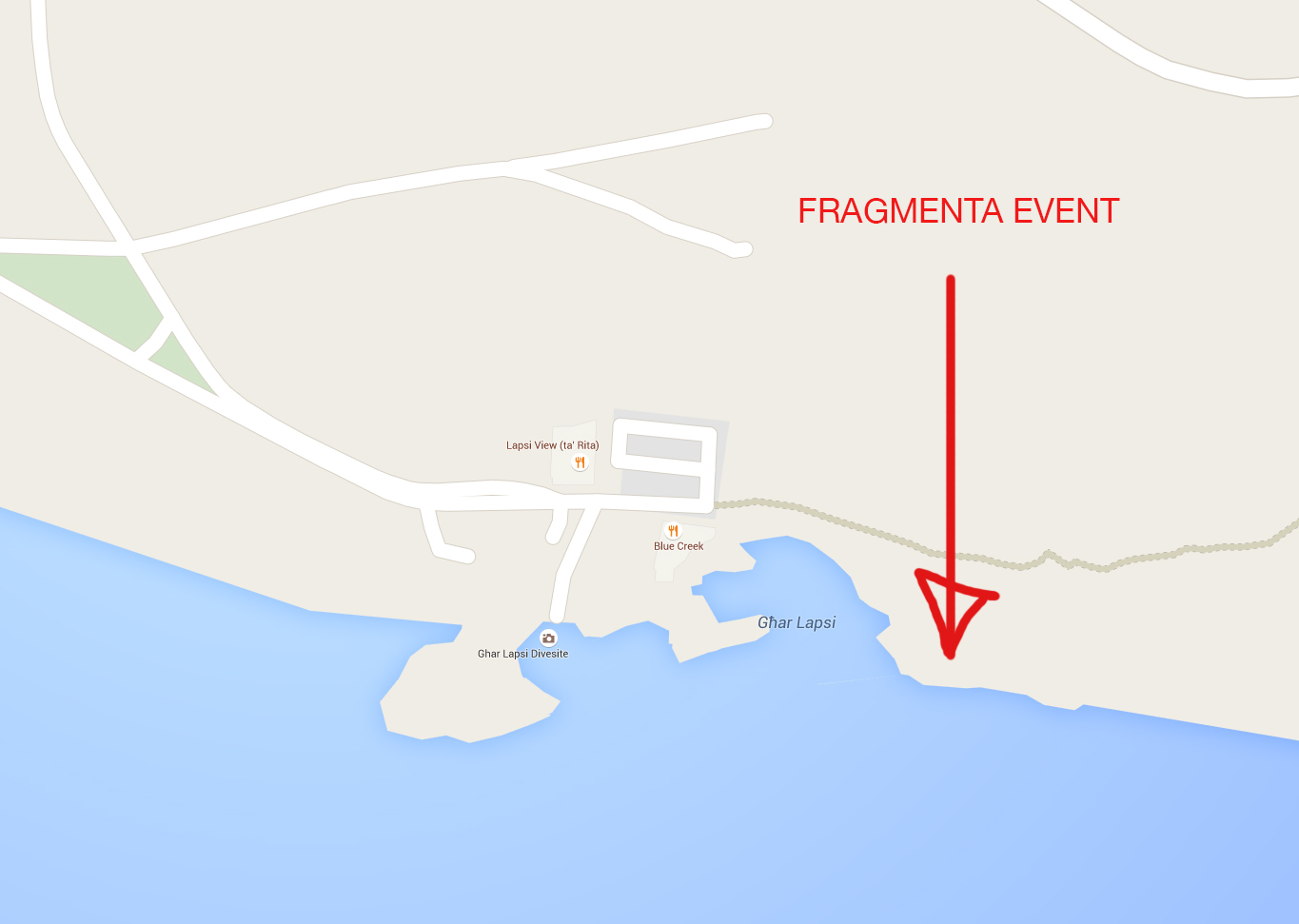Drive to Ghar Lapsi and park in carpark. Head into field road, leaving the Blue Creek restaurant on your right. After 83 m, turn right and head down towards the small bunker.