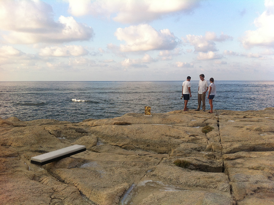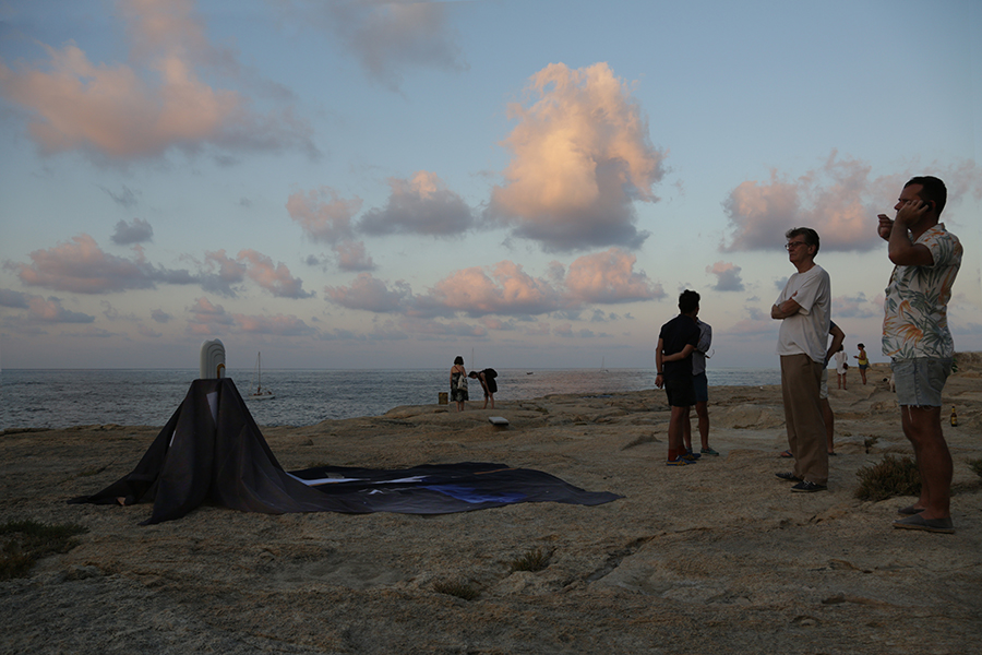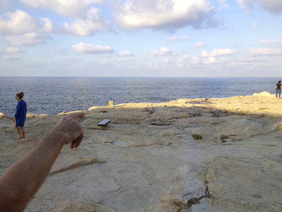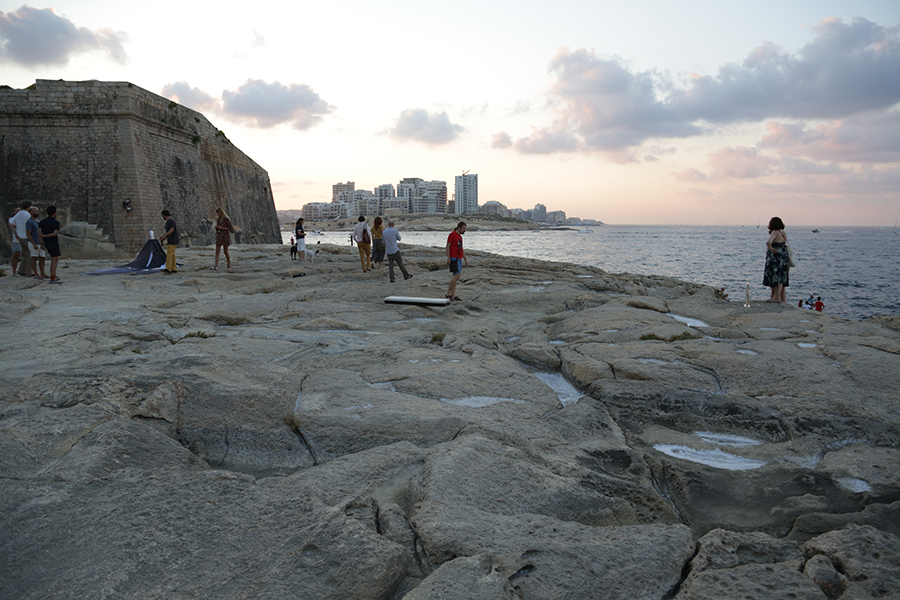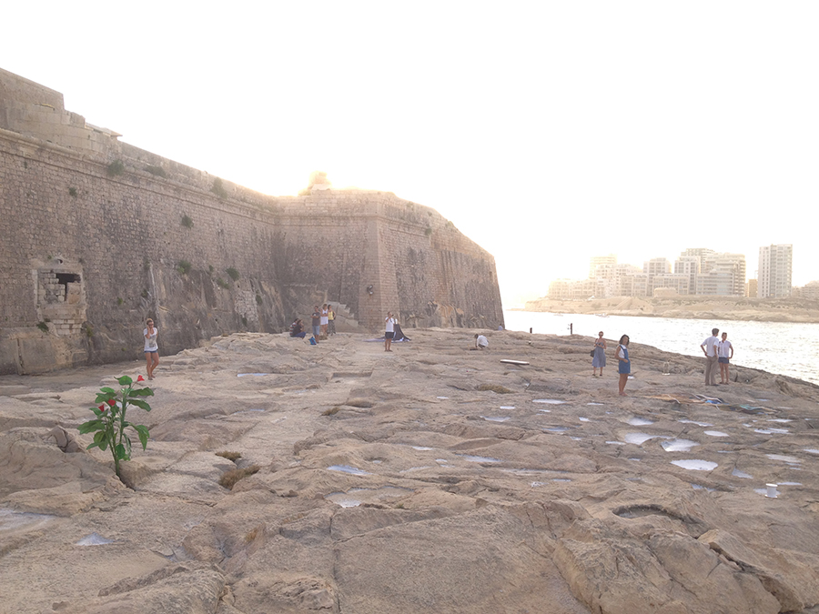 The exhibition The Valley of Thousand Pleasures took place on a natural platform alongside a footpath encircling Fort St. Elmo at the tip of Valletta. The ground is made of hard sandstone and contains natural cavities, in which, in times, saltwater collected and dried, providing natural saltpans. The mineral aspects of the landscape resemble a lunar landscape. To the one side – the sea; to the other side – the open waters.